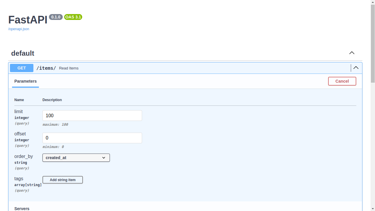 Você pode ver os parâmetros de consulta nos documentos de IU em /docs:
